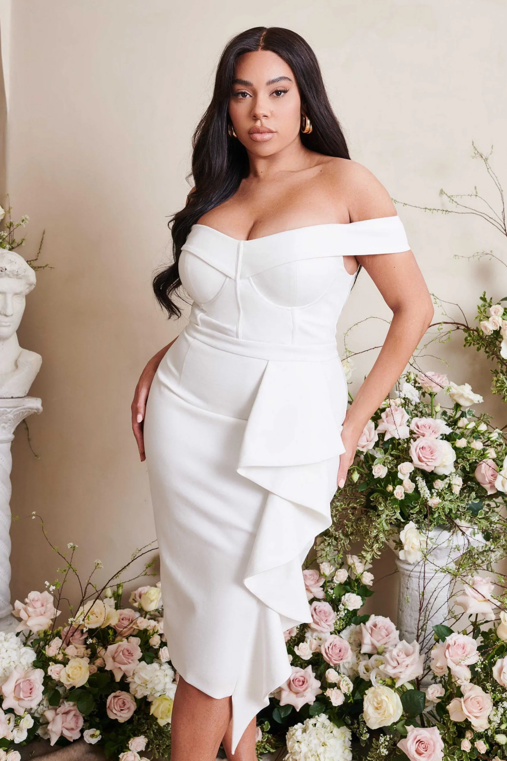 A Ruffle Moment. Make A Classic Statement This Season In Our Eden White Off Shoulder Midi Dress. Elevate Your Dress Game With This Stunning Midi Featuring Exquisite Folded Detailing.