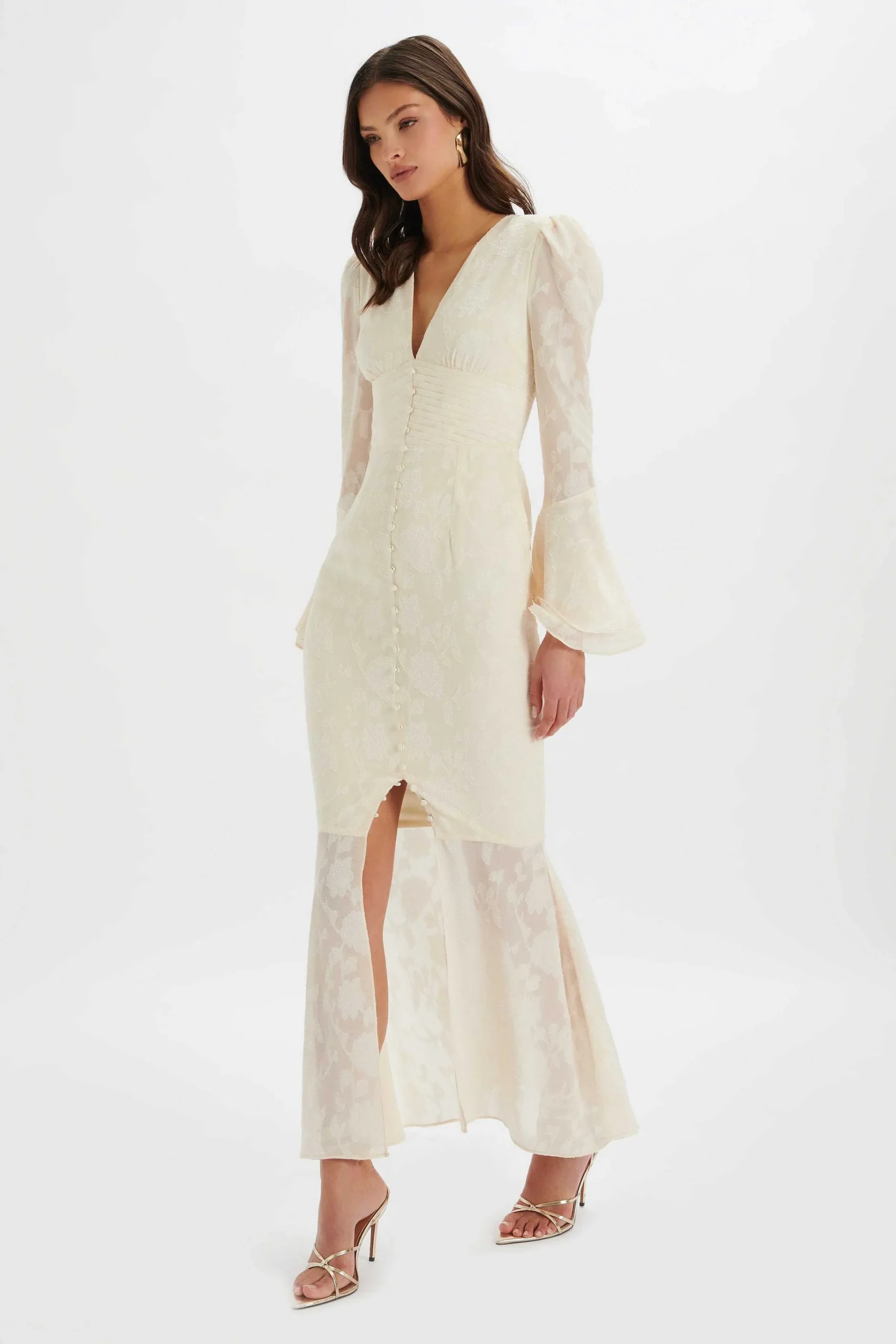Experience Effortless Elegance In Our Lauren Fluted Sleeve Maxi Dress. Made From Premium Floral Textured Chiffon In A Cream Hue, This Dress Features Fluted Sleeves And A Fishtail Hem For An Elongated Contour, While The Micro Button Detailing Down The Centre Front Adds A Touch Of Sophistication. This Dress Is Perfect For Any Spring Or Summer Event, Especially When Paired With A Tan.