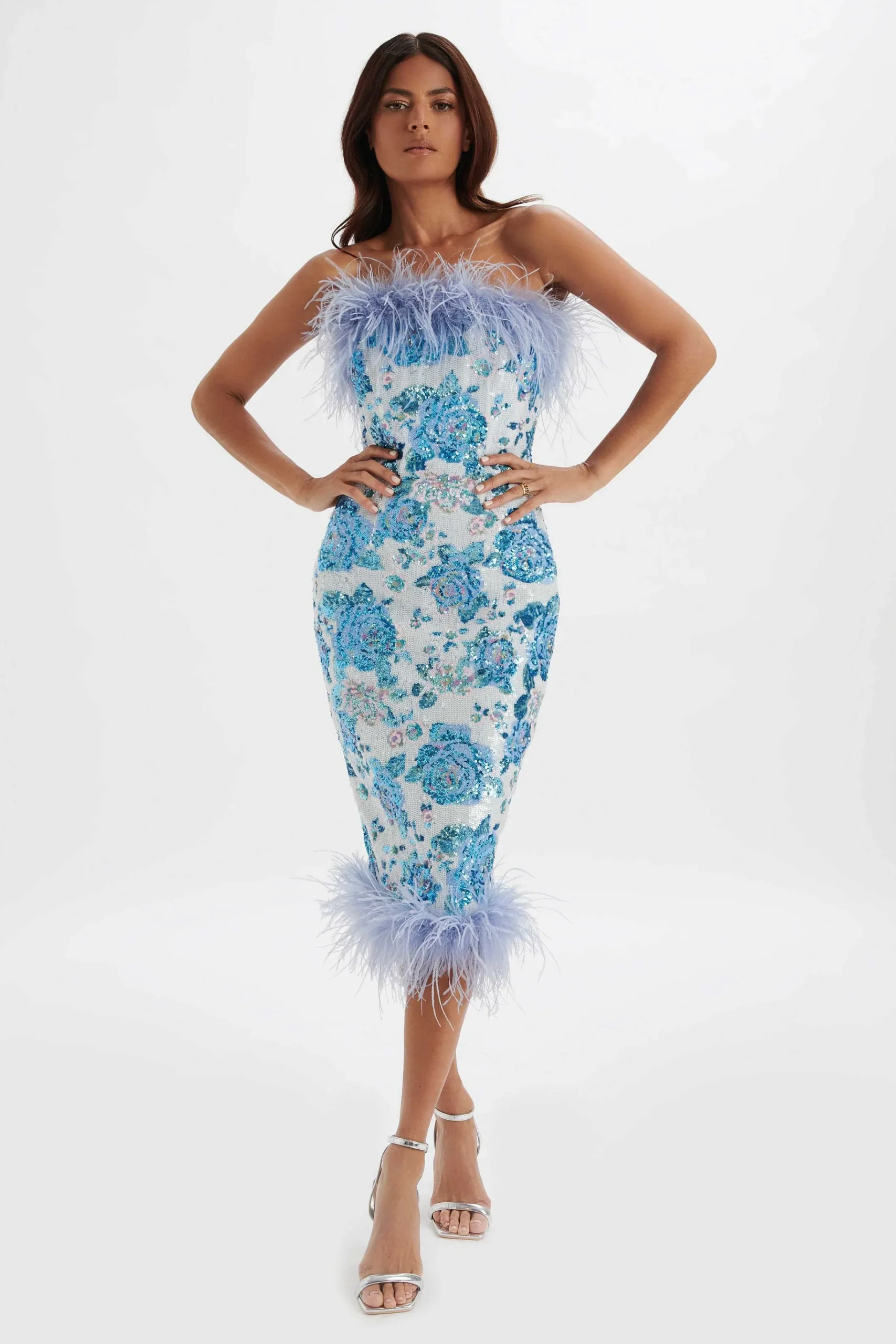 Discover Your New Statement Piece With The Sami Feather Bandeau Midi Dress In White And Cornflower Blue. The Close-To-Body Design And Flattering Silhouette Are Accented By A Beautiful Blue Feather Trim On The Neckline And Hem. Featuring A Bespoke Floral Print Adorned In Luxe, Light- Catching Sequin Fabric, This Dress Is Perfect For Any Special Occasion.