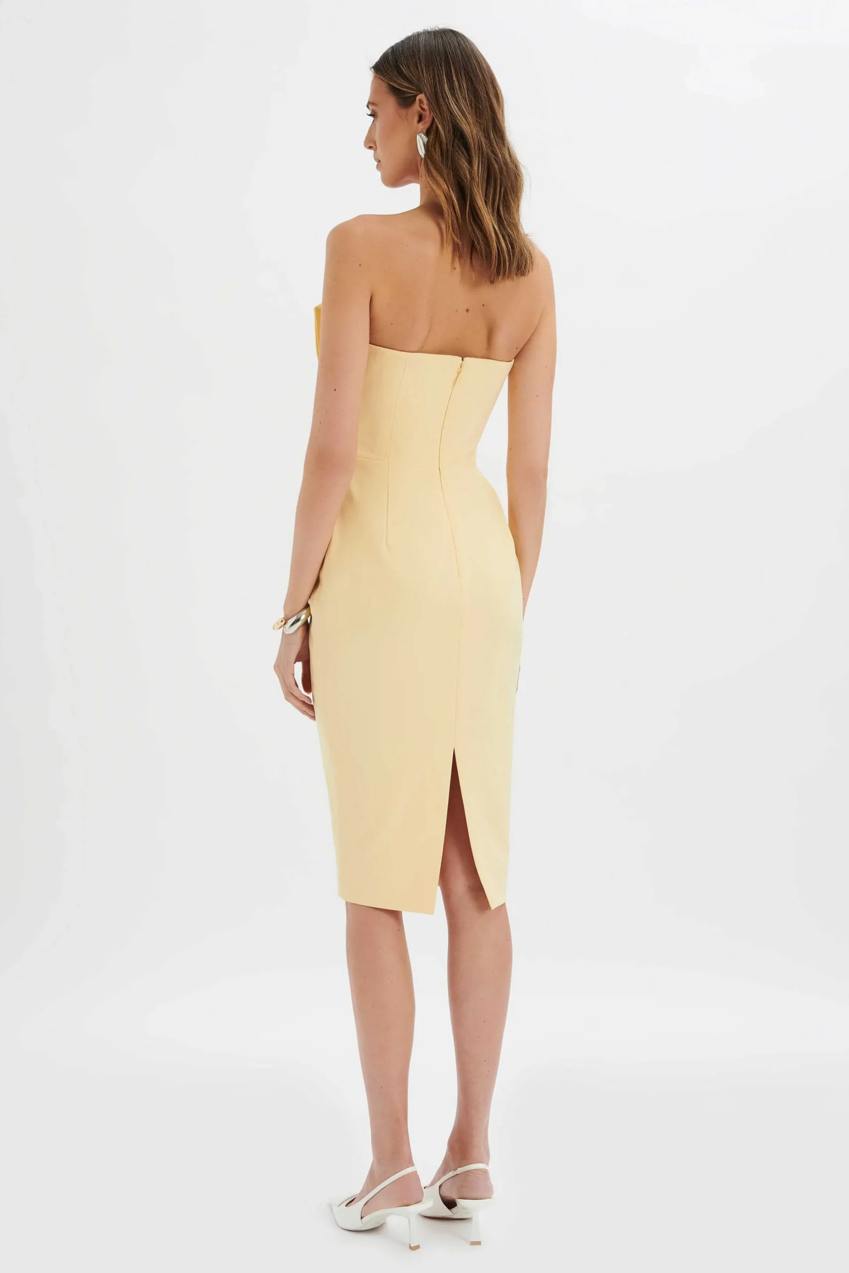 Expertly Designed For Sophisticated Style, The Imogene Asymmetric Pleated Frill Detail Midi Dress In Butter Yellow Features Bonded Satin With An Asymmetrical Design And Pleated Frills. The Butter Yellow Hue Adds A Touch Of Elegance To The Bandeau Neckline And Close To Body Fit, And Cinches At The Waist For A Flattering Silhouette.