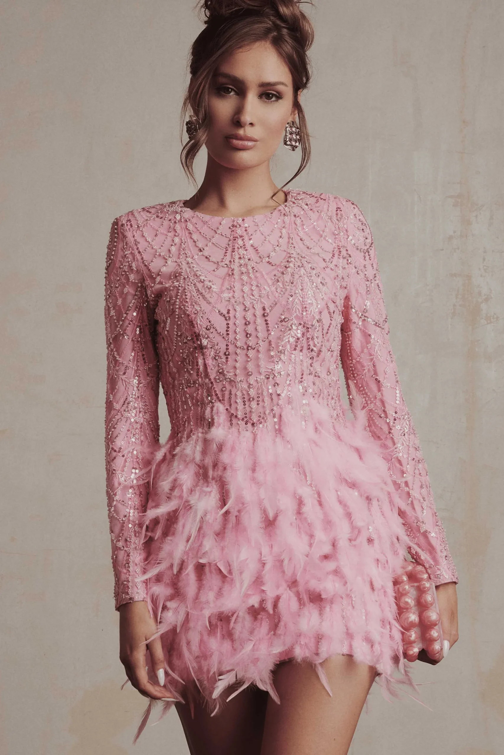 The Selene Mini Dress In Pink Offers A Stunning Aesthetic With Its Sequin Embellishment, Beaded Embroidery, And Bespoke Feather Appliqué Skirt. Its Premium Silhouette Is Enhanced By Concealed Shoulder Pads And Bust And Waist Darts, While The Double Layer Pink Lining Adds Functionality. Perfect For A Close-To-Body Fit, This Long Sleeve Mini Dress Is Sure To Make A Statement.