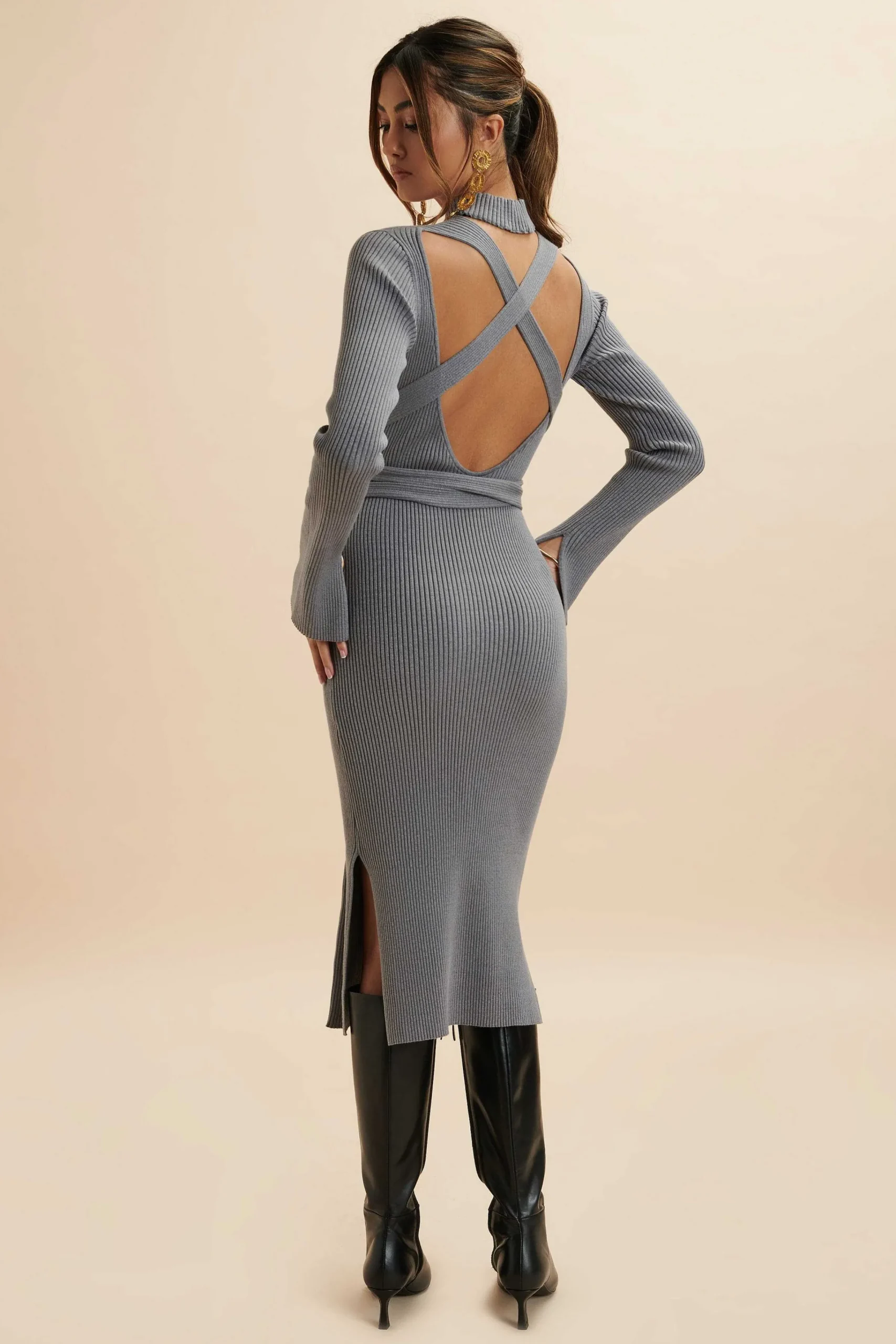 The Romi Midi Dress Is Knitted With Fine Yarns For A Luxurious Feel. The High Neck And Open Low Back Add A Touch Of Elegance, While The Cross-Over Wrap Tie Belt Cinches The Waist For A Flattering Fit. The Long Sleeves Feature Fluted Cuffs, And The Straight Hemline Is Finished With Side Splits For A Sophisticated Look. Perfect For Any Occasion, This Dress Is Both Fitted And Comfortable.